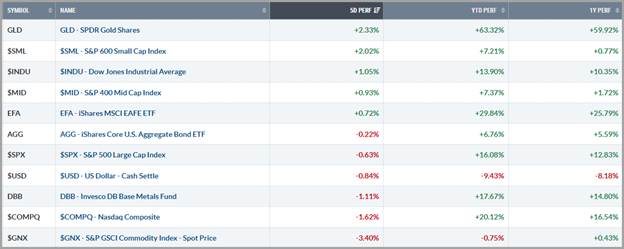 Longer term Treasury yields edged higher last week, with the 10-year yield hovering just above 4.15% following the Fed’s signal that rate cuts are likely on pause while the U.S. Dollar Index weakened modestly despite generally in-line economic data. Investors took comfort in Chair Powell’s reassurance that rate hikes are not under consideration. The softer dollar offered limited support to select commodities, though broader risk-off flows weighed on industrial metals and energy.